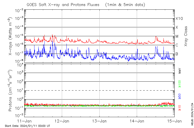 This page provides light-curves generated from GOES soft X-ray and Particle data for the date indicated at the top and the preceding three days.