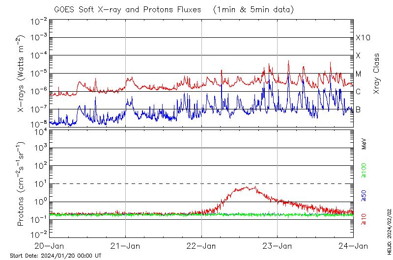 This page provides light-curves generated from GOES soft X-ray and Particle data for the date indicated at the top and the preceding three days.