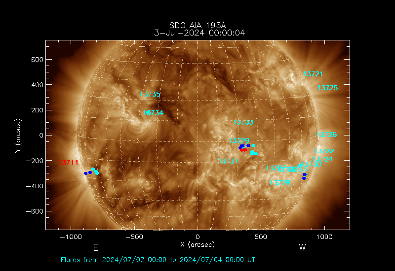 Flares for the 48 hours leading up to the time are over-plotted; these are rotated to the time of the FITS image.