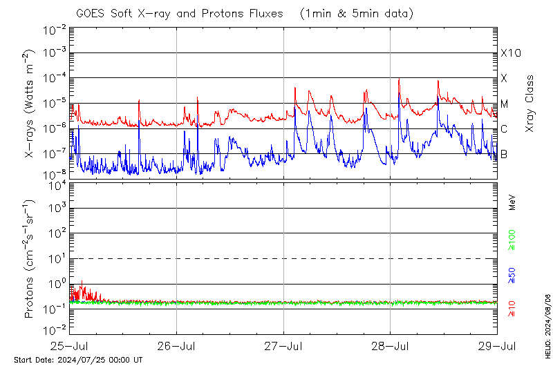 This page provides light-curves generated from GOES soft X-ray and Particle data for the date indicated at the top and the preceding three days.