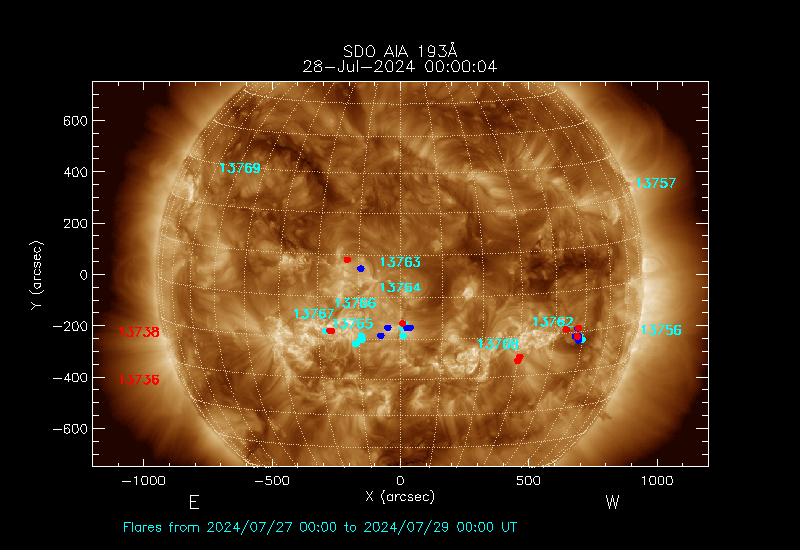 The most recent flares (≤12 hours) are shown as red dots, 12-24 hours ago as blue dots and older ones as turquoise dots.