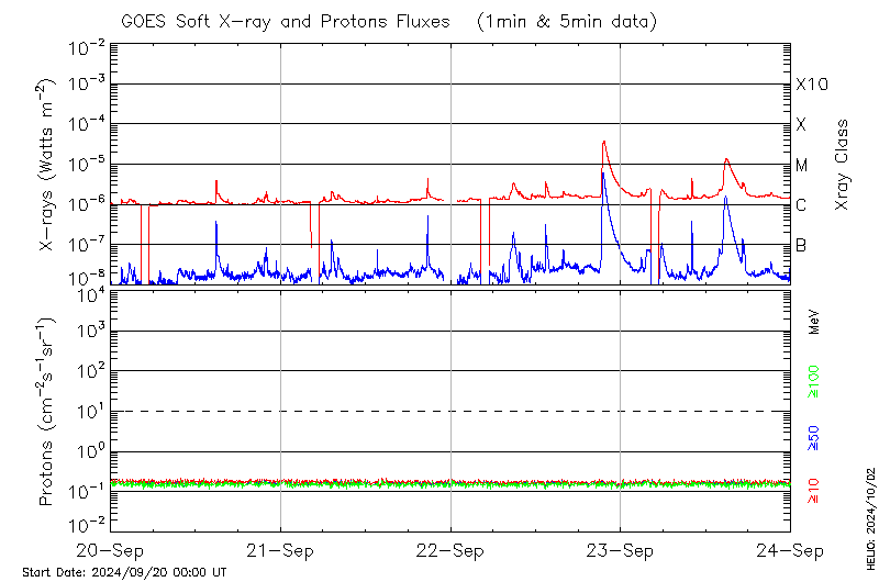 This page provides light-curves generated from GOES soft X-ray and Particle data for the date indicated at the top and the preceding three days.