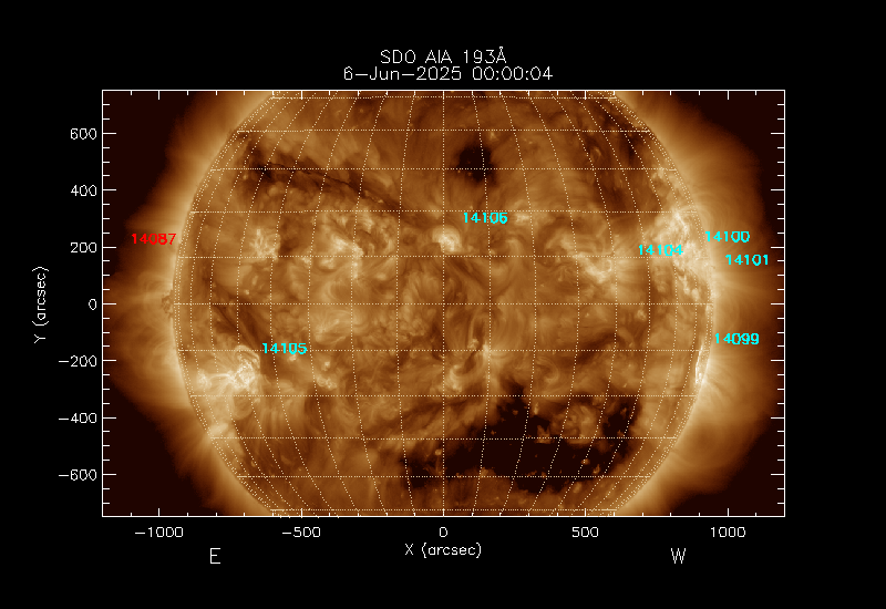 Click on an Active Region plot to display the Region Report including the region evolution and flaring history. HEC Search for NOAA Active Regions (SRS) records for this date and the day before.